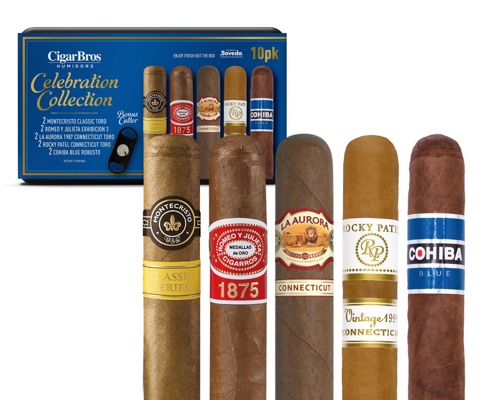 Celebrate in style with this expertly curated 10-cigar sampler from CigarBros. Featuring standout selections from iconic brands like Montecristo, Romeo y Julieta, La Aurora, Rocky Patel, and Cohiba, this collection brings together a variety of premium blends perfect for any occasion. Each cigar is handpicked for its unique flavor, construction, and classic appeal—delivered fresh in a custom CigarBros Personal Humidor with a bonus cutter included.